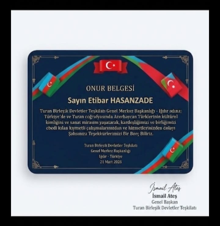 Yazar Etibar Həsənzadə Turan Birleşik Devletler Teşkilatı Genel Başkanı İsmail Ateş və yönetim kurulu tərəfindən Türk dünyasına xidmətlərinə görə Onur Belgesi ilə mükafatlandırıldı.