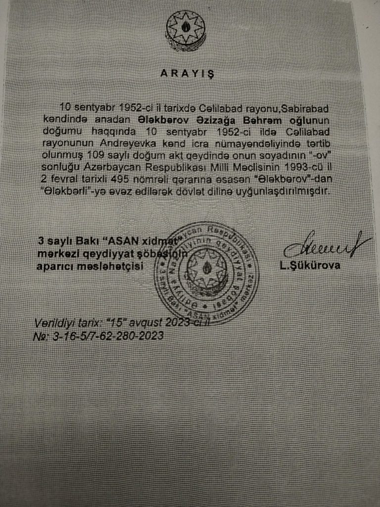 Düz 30 il idi ki, soyad sonluğumda -ov xəcalətini üstümdə gəzdirirdim. Hər il Universitetdə dərs dediyim tələbələrimin ad sonluğuna baxanda dəyişikliklərin müsbətə doğru artdığını görüb sevinirdim. Elə ailəmdə də uşaqlarımın soyadlarını dəyişdirmişdim. Bu da mənə bir təsəlli idi.Ancaq öz-özümə içimdə həmişə bir sual verirdim: Bəs sən, sən özün niyə hələ də soyadını dəyişdirməmisən, hələ də soyadının sonluğunda -ov sonluğunu əzizləyə-əzizləyə saxlamısan? Bu 30 il ərzində üç dəfə dəyişdirməyə calışmışam. İlk dəfə Azərbaycan Respublikası Milli Məclisinin 1993-cü il 2 fevral tarixli 495 saylı qərarı mətbuatda dərc olunan günün səhərisi Yasamal rayonunun (onda hələ səhv etmirəmsə, Oktyabr rayonu idi) Nizami metrosunun yaxınlığındakı Vətəndaşlığın qeydiyyatı şöbəsinə müraciət etdim.Orda elə bir ironiya ilə qarşılaşdım ki, düzü o anı xatırlayanda məmurlarımızda heç olmasa iynənin ucu boyda milli hissin olmamasına görə çox təəssüf hissi keçirdim. “Rəhmətliyin oğlu, millət nə hayda, sən nə hayda! Soyadını dəyişəndə nə dəyişəcək ki?!” Millətin nə hayda olduğunu bilirdim, ancaq belə soyuqqanlı, rusbaşlı, rus düşüncəli məmurlarımızın idarələrimizdə oturub, hələ də naftalin düşüncəsi ilə yaşadığını, “bəlkə də qaytardılar?” havasına kökləndiyini bu dərəcədə bilmirdim. İkinci dəfə 2010-cu ildə müraciət edəndə doğum şəhadətnaməsi mütləq vacibdir dedilər. Həmin vaxtdan doğum şəhadətnaməsinin axtarışı bu günlərdə səmərəsini verdi. 1984-cü ildə şəhərə gəlmişdim.O vaxtdan kimin yadına doğum şəhadətnaməsi düşürdü ki?! Bir də o vaxtlarda lazımsız bir sənd kimi idi, kimə və nəyə lazım idi ki?! Nəhayət yaxın günlərdə doğum şəhadətnaməsini tapmağıma görə çox sevindim.Nəhayət uzun illərdən sonra ƏLƏKBƏROV soyadını ƏLƏKBƏRLİ ilə əvəzlədim. Bilirdim, ömürdən bu qədər qazandığım sənədlər, diplomlar köhnə soyadla yazıldığı üçün gərək yeni soyadımı təsdiqləyən Arayışı həmişə yanımda gəzdirməli olacam. Yaxud hansısa bürokrat yeri gələndə bəlkə də məzələnib Arayışın notariat qaydasını da istəyə biləcək.Eybi yoxdur , qoy nə qədər çətinlik, ya hansısa problem olursa olsun! Əsas odur ki, soyadımı rus çirkabından təmizlədim. Həmişə bu fikir mənə ağır gəlirdi ki, niyə Ermənistanda, Gürcüstanda, Pribaltika ölkələrində yox, məhz bizdə və digər türkdilli respublikalarda məcburi şəkildə Moskvanın göstərişi ilə, özü də millətin rəyini soruşmadan soyadı sonluğunu dəyişdirmişdilər. Bu soyadı sonluğunu 3 SAYLI “ASAN XİDMƏT”ində bir həftəyə dəyişdirdilər. Sağ olsunlar, bir manat belə xərc çıxmadan çox böyük sayğı ilə bunu etdilər. Söhbət əsnasında bir məsələni də öyrəndim ki, valideyinlərin bəziləri hələ də köhnə soyad sonluğunu, könüllü olduğu üçün, övladlarının soyadlarında hələ də saxlayırlar. Məgər o vaxt Moskva bizim soyad sonluğumuzu -ov, – yev edəndə bizdən soruşmuşdu ki, sən razısan, ya yox?! Qətiyyən soruşmamışdı! İndi biz müstəqillik dövründə bu ləkəni üstümüzdə hələ də niyə saxlamalıyıq? Bəlkə valideyinlərin çoxusu bunun mahiyyətini yaxşı bilmir, ona görə də köhnə düşüncədən əl çəkmirlər? Vətəndaşlıq aktlarını qeydiyyata alan orqanlar həmin valideyinlərlə niyə söhbət aparmasın? Niyə bunun mahiyyətini aydınlaşdırmasın? Gərək hər bir insanın içində vətəndaşlıq duyğusu olsun!Biz, Allaha çox şükür ki, müstəqil dövlətçiliyə sahibik! Gəlin dövlətimizin arxasında dayanaq, özümüzə, söyumuza, kökümüzə qayıdaq! Vallah, özümüzə qayıdanda ancaq böyük ola bilərik!